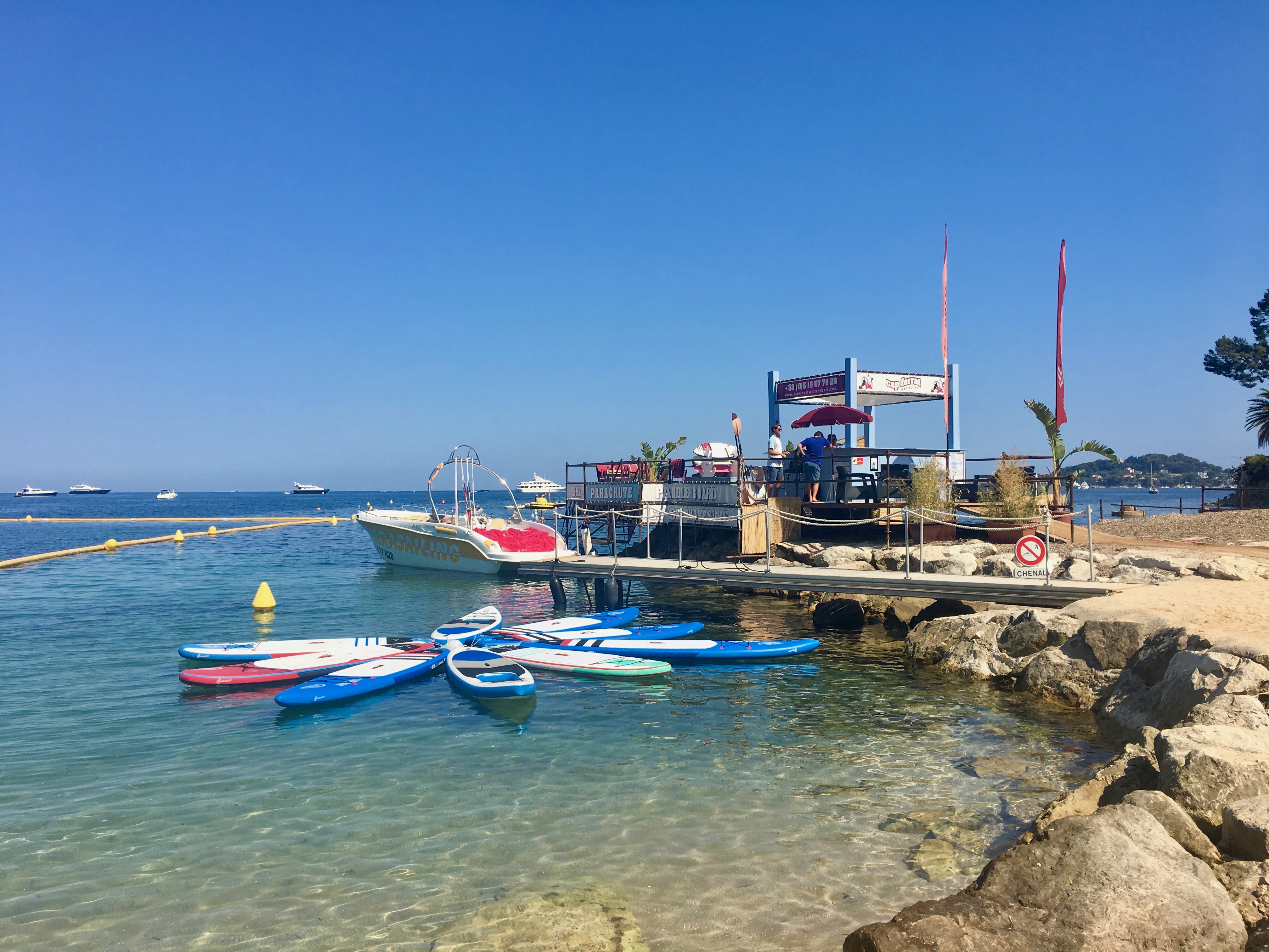 Nous avons loué des planches à pagaie chez CFW aujourd'hui et avons eu une incroyable pagaie et nagé jusqu'au cap. C'est la meilleure façon d'explorer toutes les petites criques et de parcourir tous les bateaux. Les prix étaient assez élevés, mais c’est le mois d’août sur la Côte d’Azur et ça en valait vraiment la peine. L’équipe est vraiment sympa et très occupée, ce qui est bon signe.